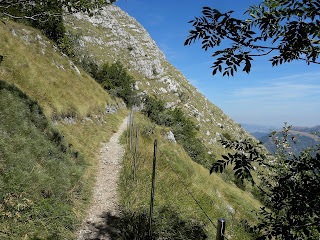 Altri venti minuti di percorso occorrono per arrivare all' ingresso della Grotta di Monte Cucco. Il sentiero si fa sempre più ripido e stretto, passando su un versante sempre più dirupato e panoramico. Il procedere in sicurezza è garantito da pali e fili metallici. Il panorama si allarga in una visuale che spazia su grande parte dei monti marchigiani. Avvicinandosi ad uno spigolo del monte il sentiero piega a sinistra, mentre l' orizzonte viene riempito dalla lunga cresta del Monte della Strega. Questo monte è incuneato tra Sassoferrato, il Monte Catria e il Cucco. La tradizione locale propone due motivazioni per questo strano nome; la prima dice che solo una strega a cavallo della sua scopa poteva stare in equilibrio sulla sua affilata cresta. Mentre la seconda ipotesi è legata all' antica Battaglia delle Nazioni tra Romani e Lega Italica del 295 a. C. a Sentinum, l' attuale Sassoferrato, in cui scese in campo una strega fra questi ultimi per propiziarne la vittoria e maledire gli odiati nemici.